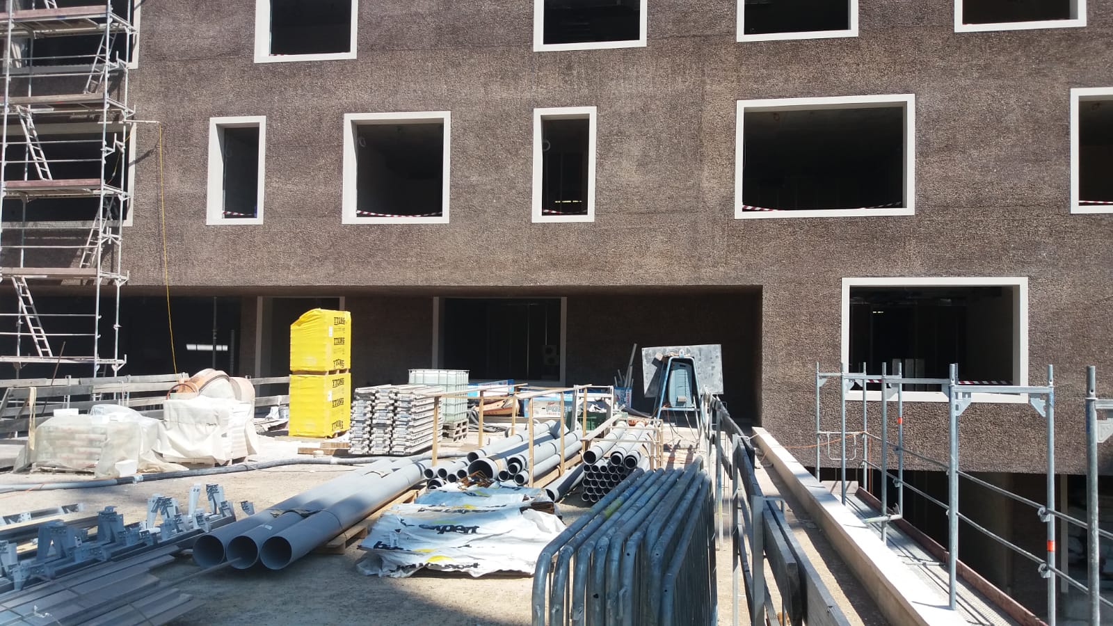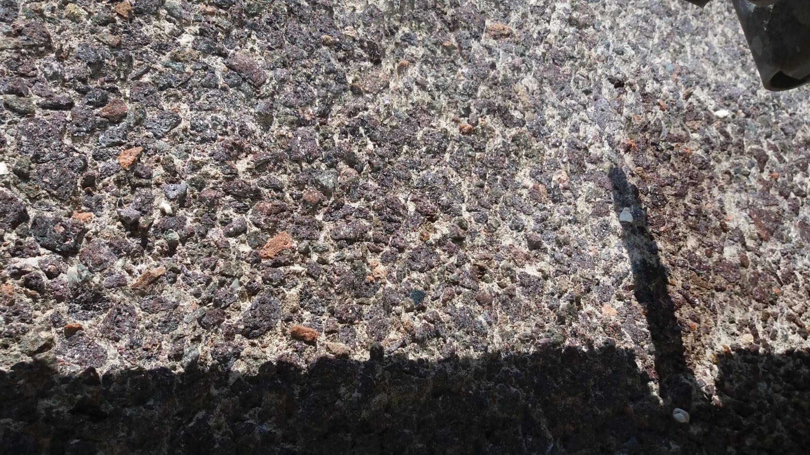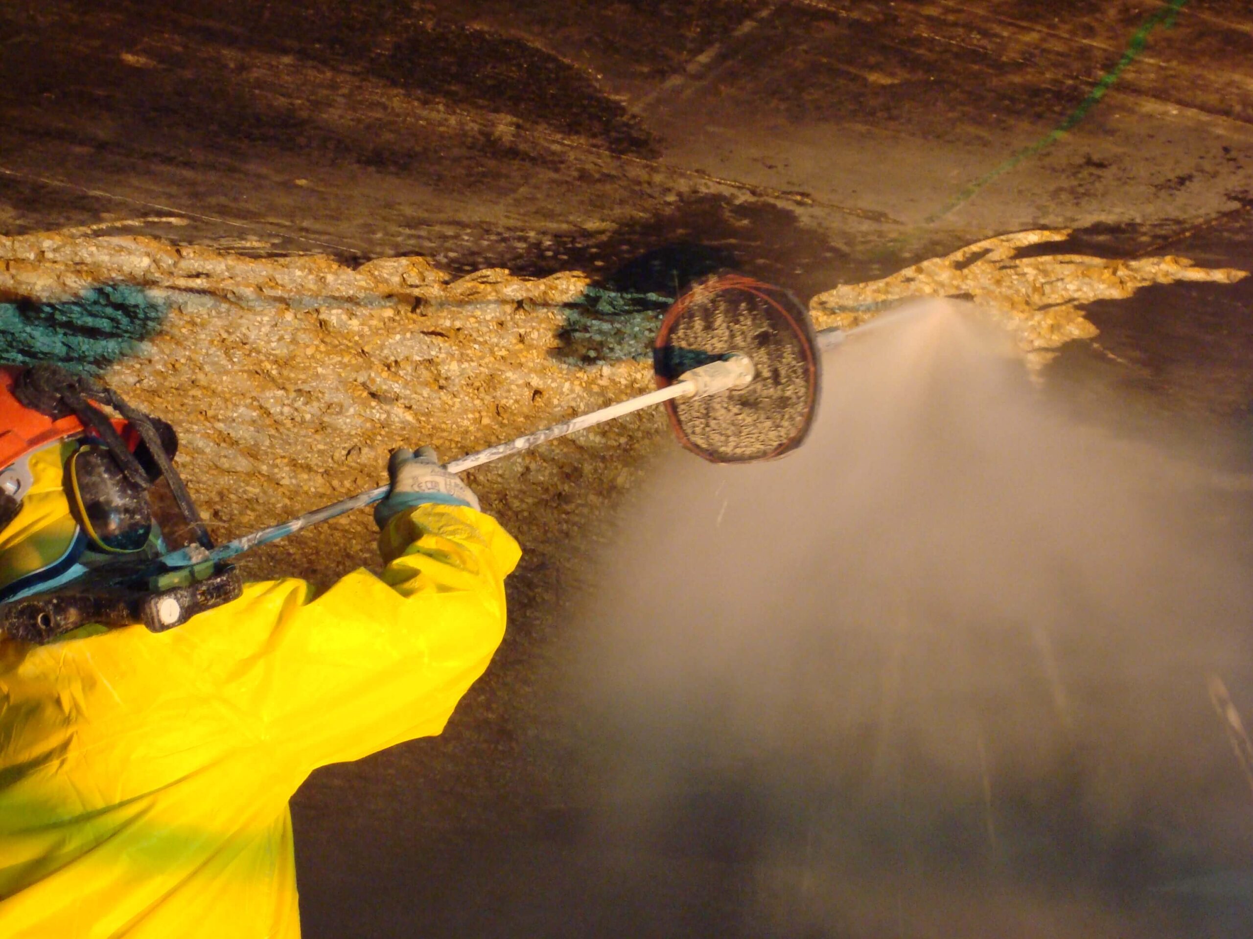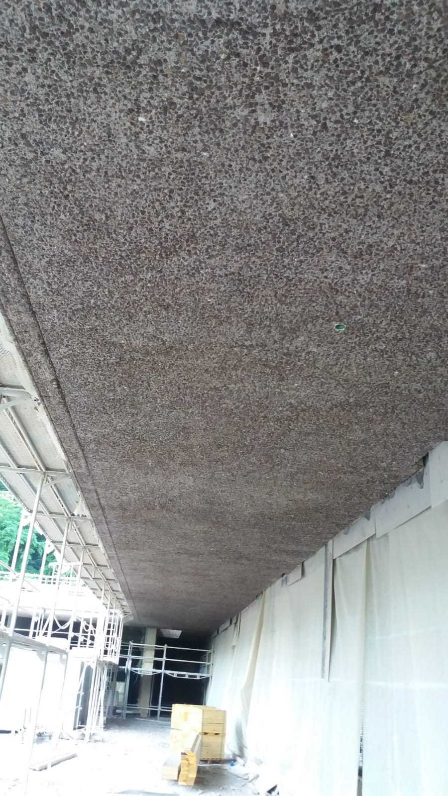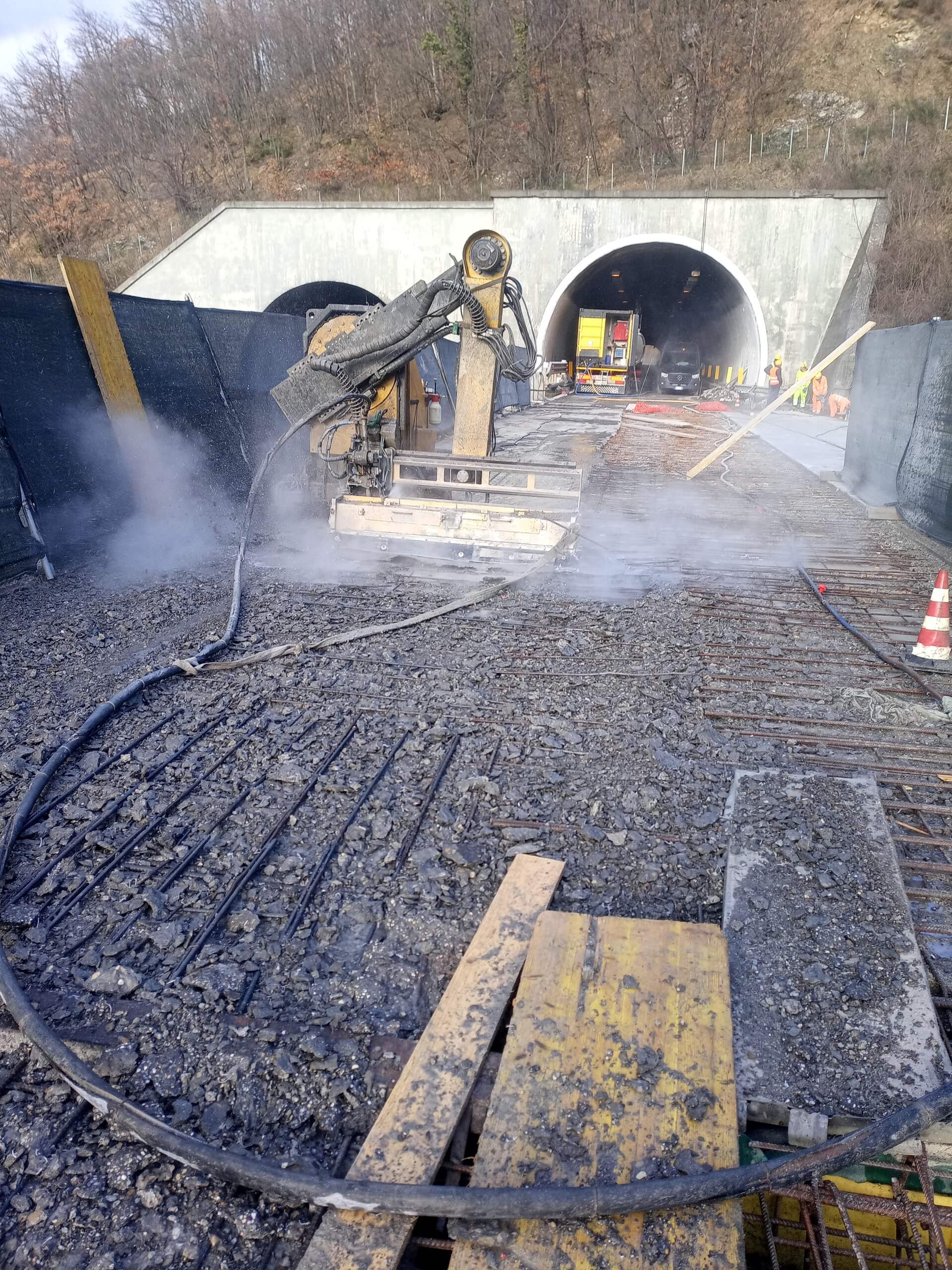 Il progetto prevedeva un intervento di idroscarifica sull’intera superficie di 5.500 m², eseguito immediatamente dopo la realizzazione della struttura. La lavorazione consisteva nell’asportazione controllata dello strato superficiale di calcestruzzo al fine di riportare in evidenza gli agglomerati di inerti rocciosi utilizzati per la costruzione.