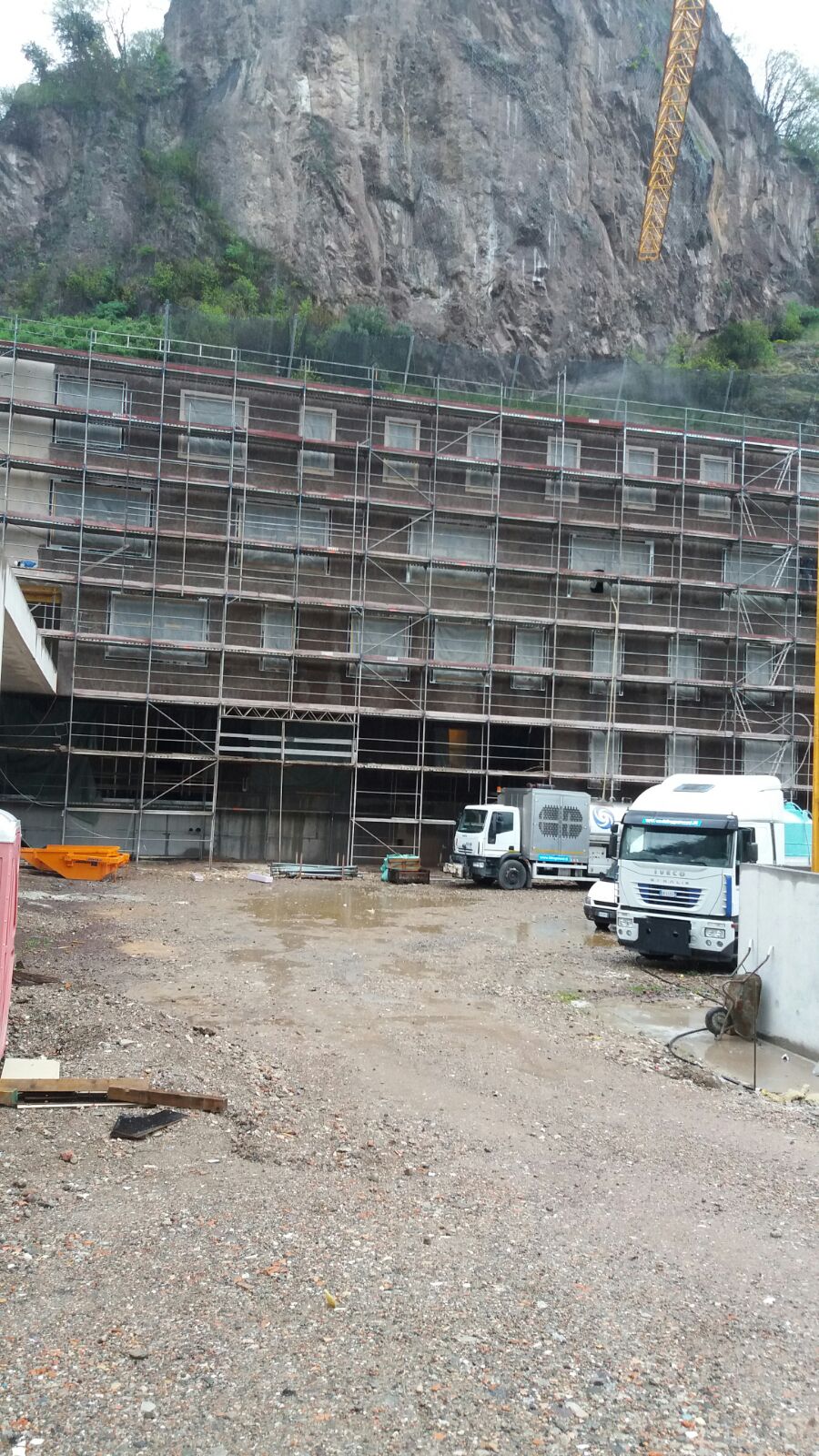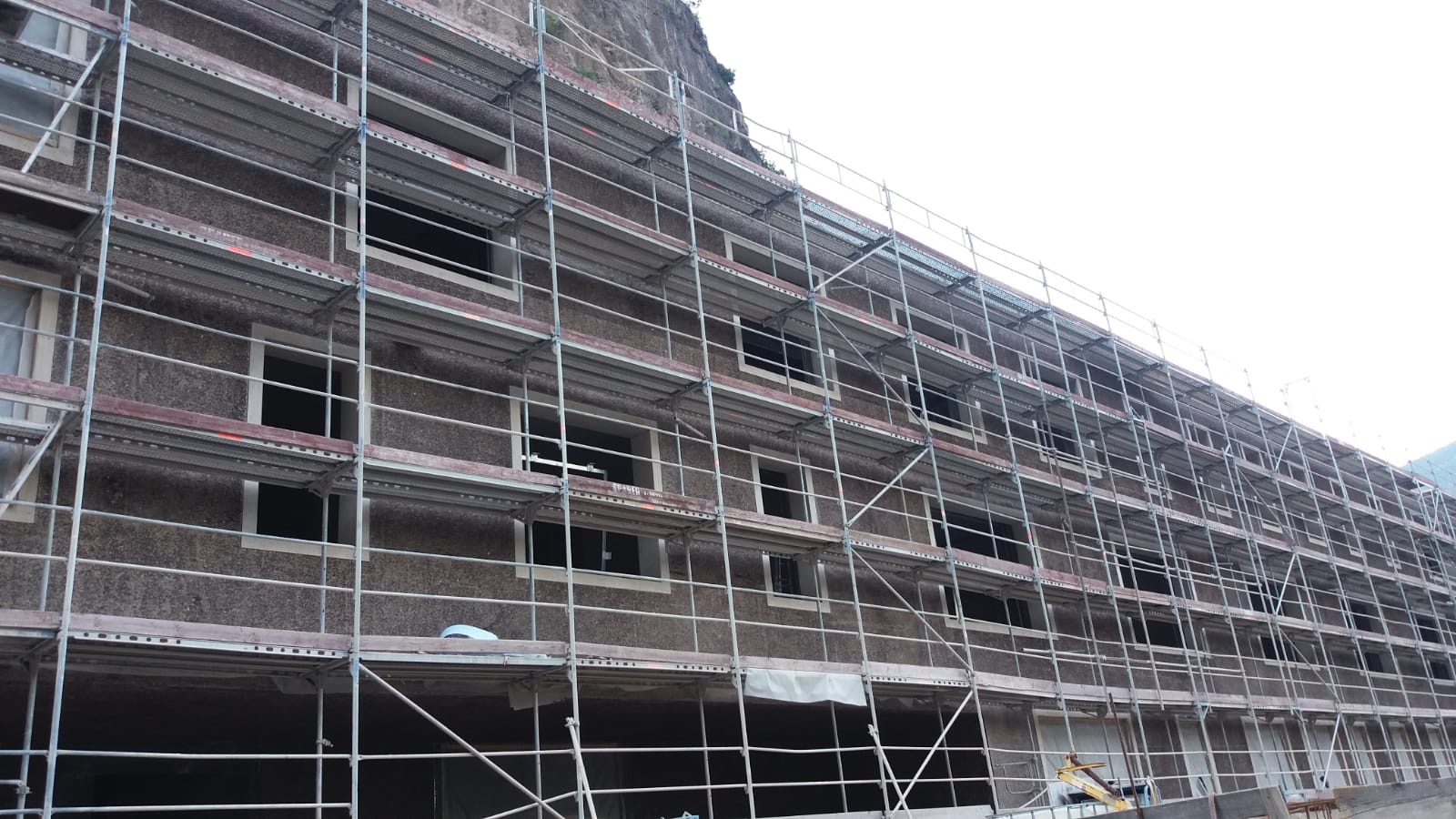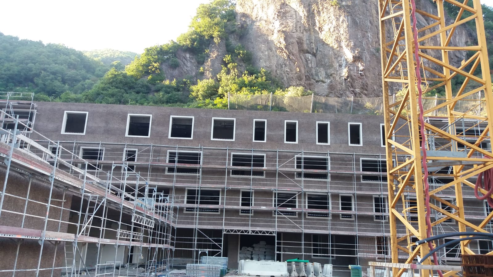 L’edificio oggetto dell’intervento sorge direttamente contro il versante roccioso della valle ed è stato progettato per apparire come un’estensione naturale della montagna, integrato nel paesaggio anziché imposto su di esso.