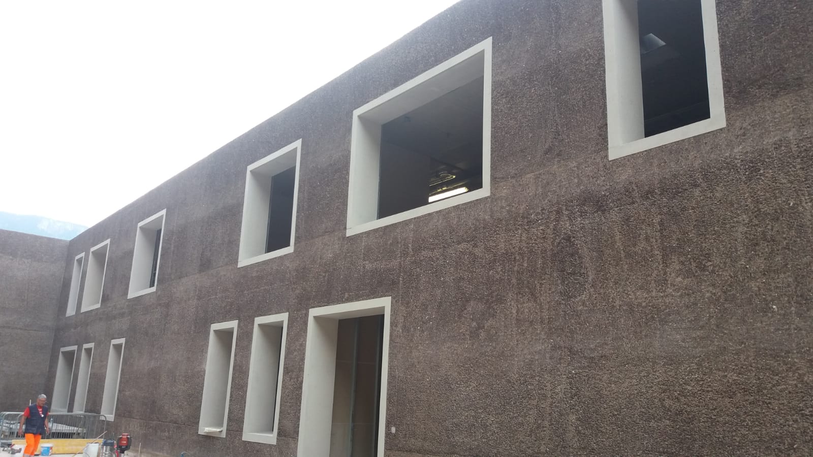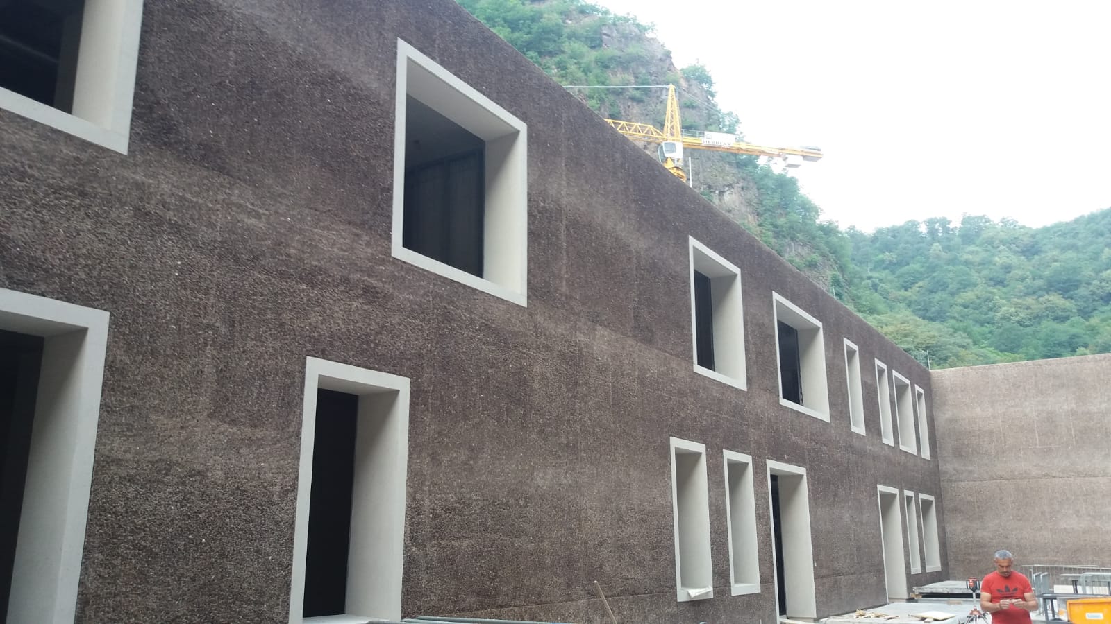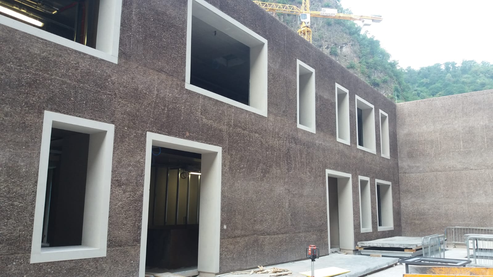 L’obiettivo era quello di enfatizzare il legame visivo ed estetico dell’edificio con la roccia retrostante, rendendolo una naturale prosecuzione del pendio e non un elemento estraneo al contesto. Grazie a questo processo, gli inerti affiorano nuovamente in superficie, creando un effetto materico e quasi organico che richiama direttamente la roccia originaria.