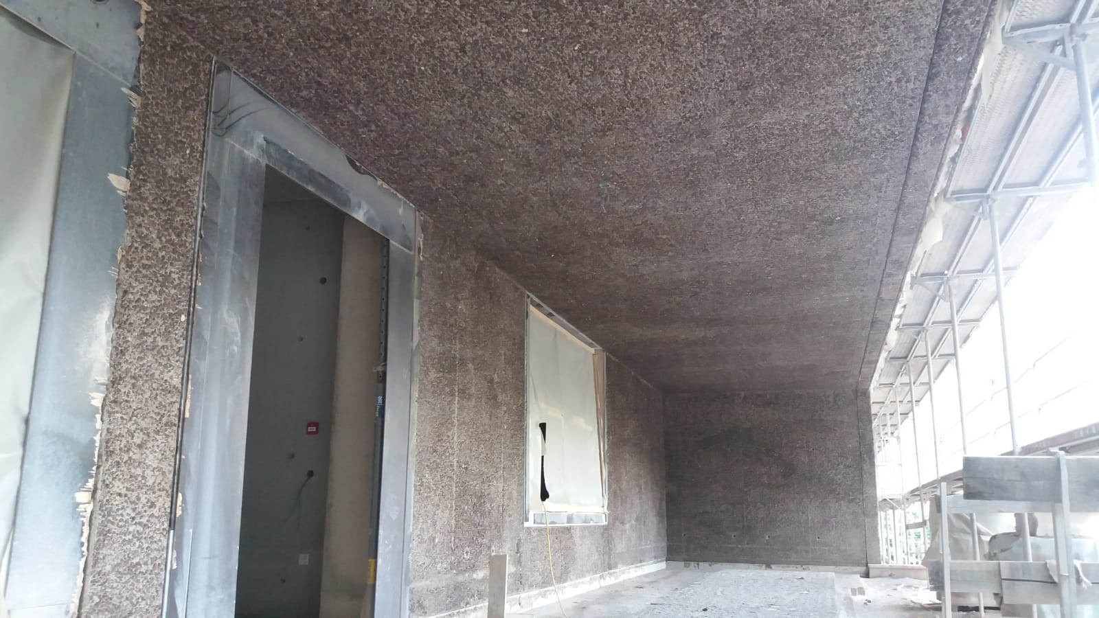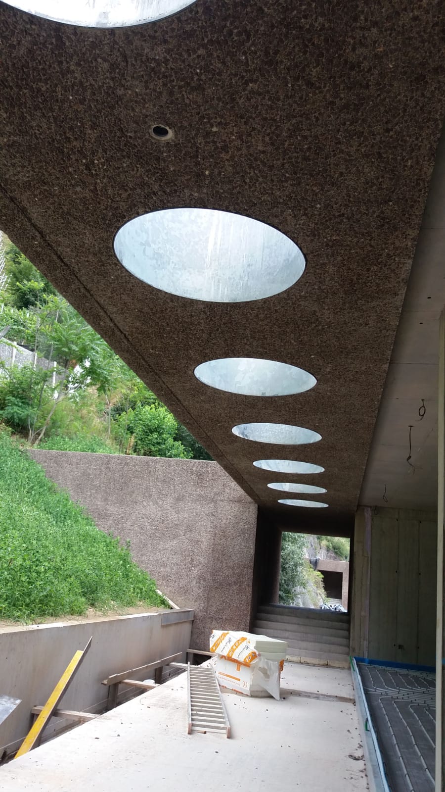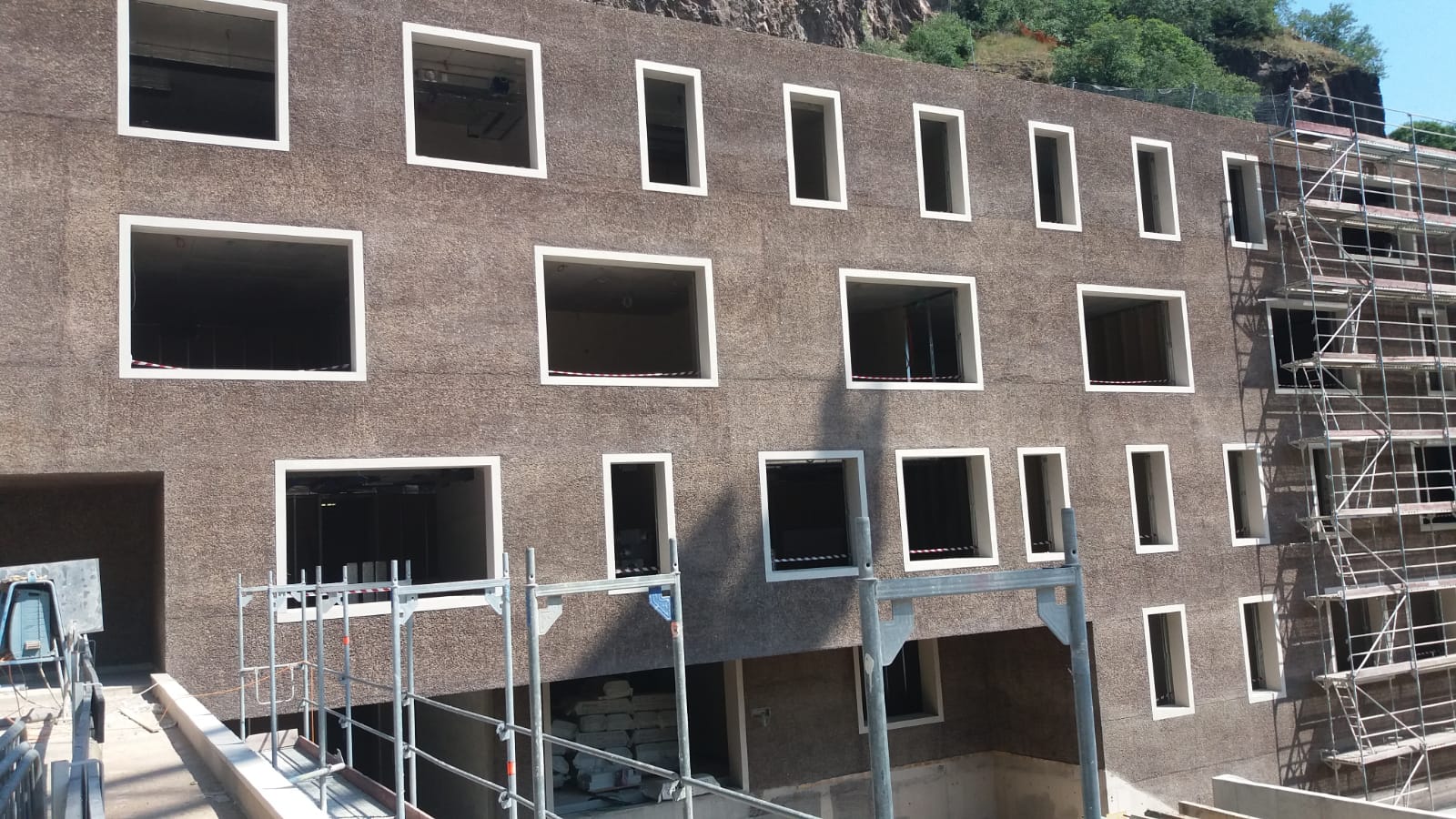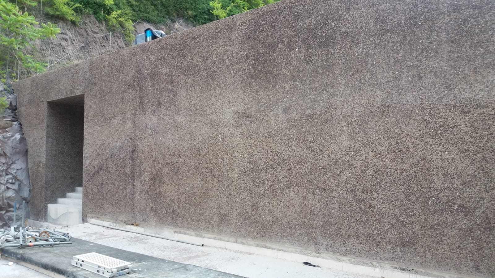 L’obiettivo era quello di enfatizzare il legame visivo ed estetico dell’edificio con la roccia retrostante, rendendolo una naturale prosecuzione del pendio e non un elemento estraneo al contesto. Grazie a questo processo, gli inerti affiorano nuovamente in superficie, creando un effetto materico e quasi organico che richiama direttamente la roccia originaria.