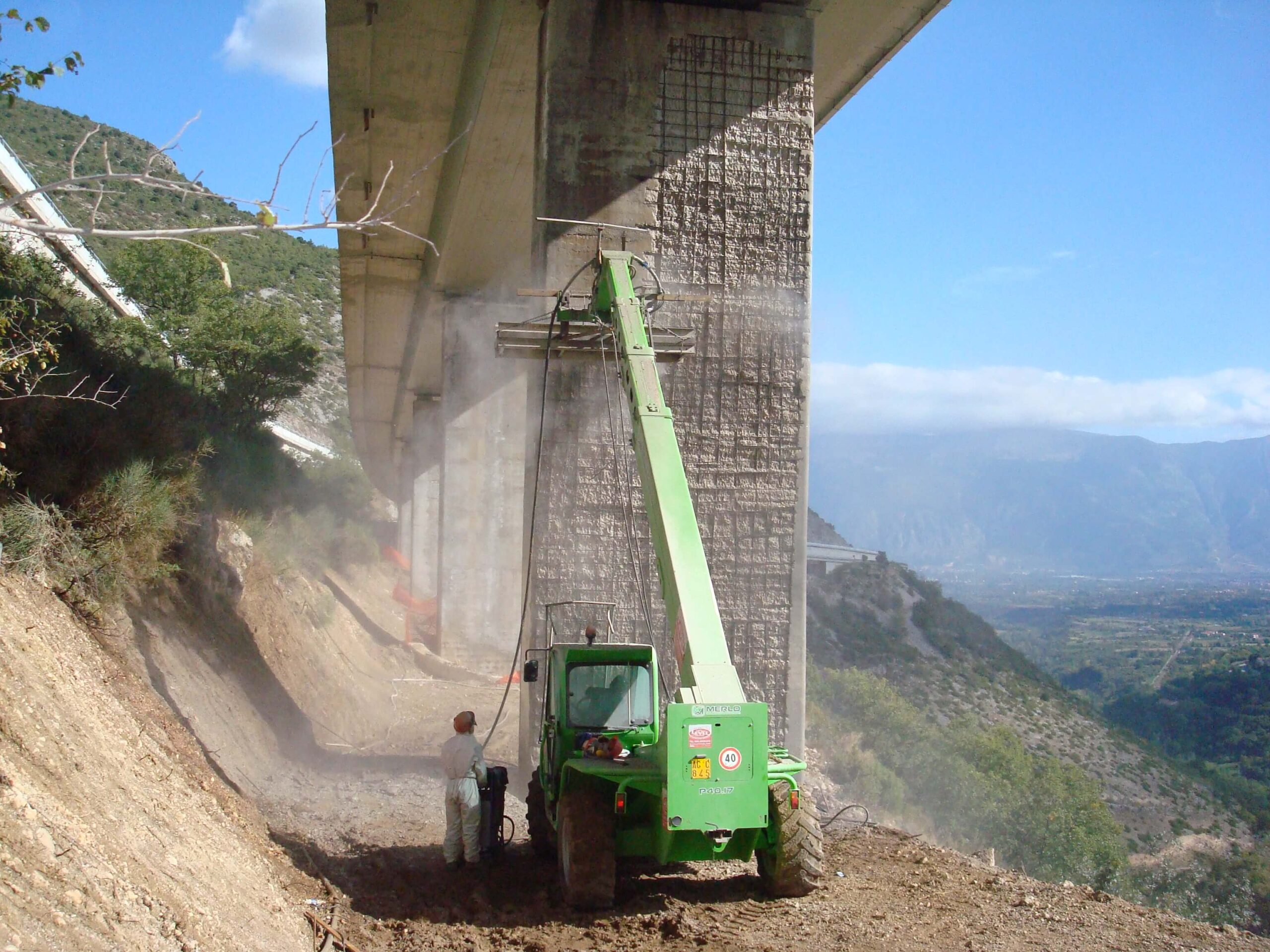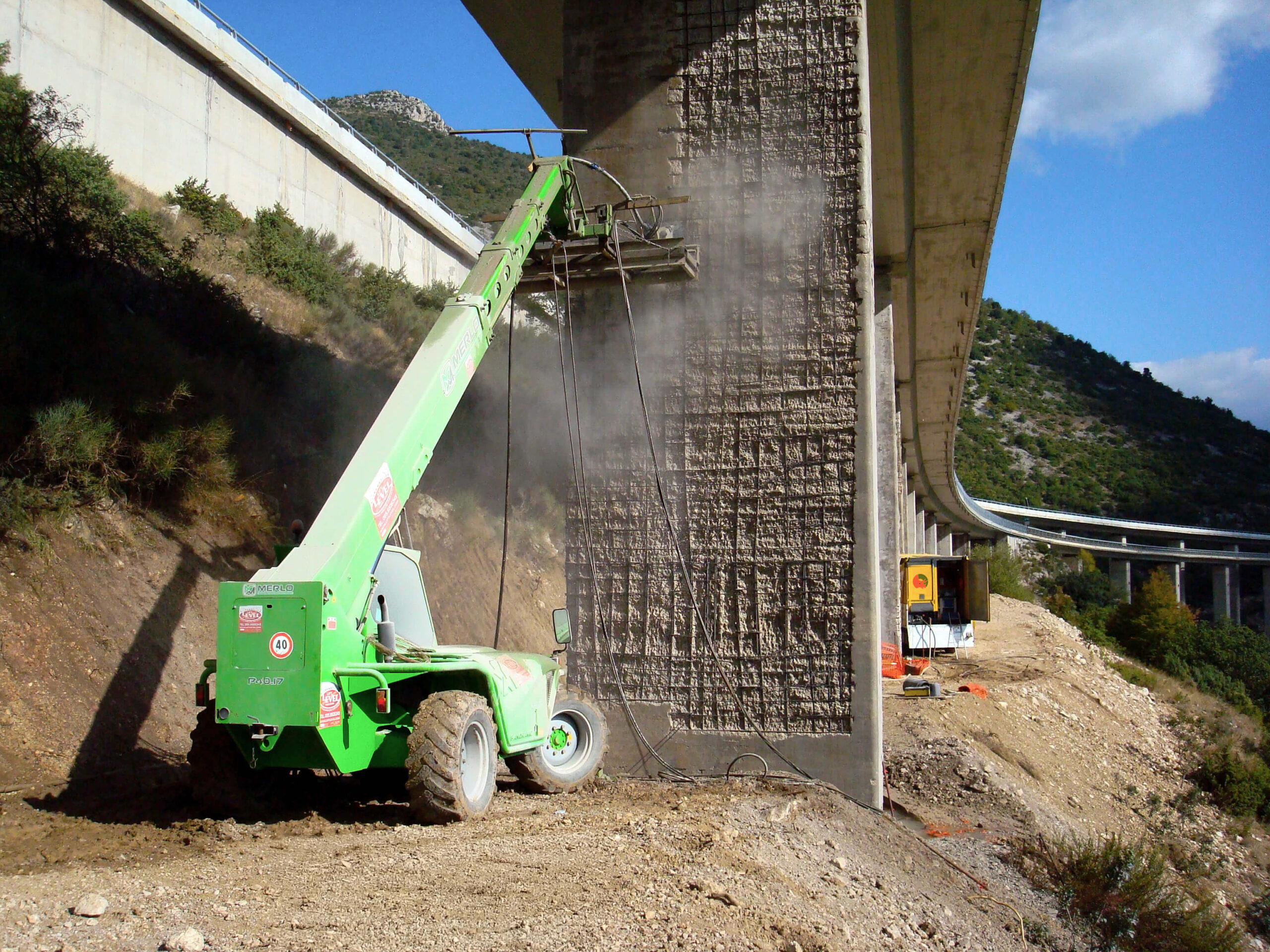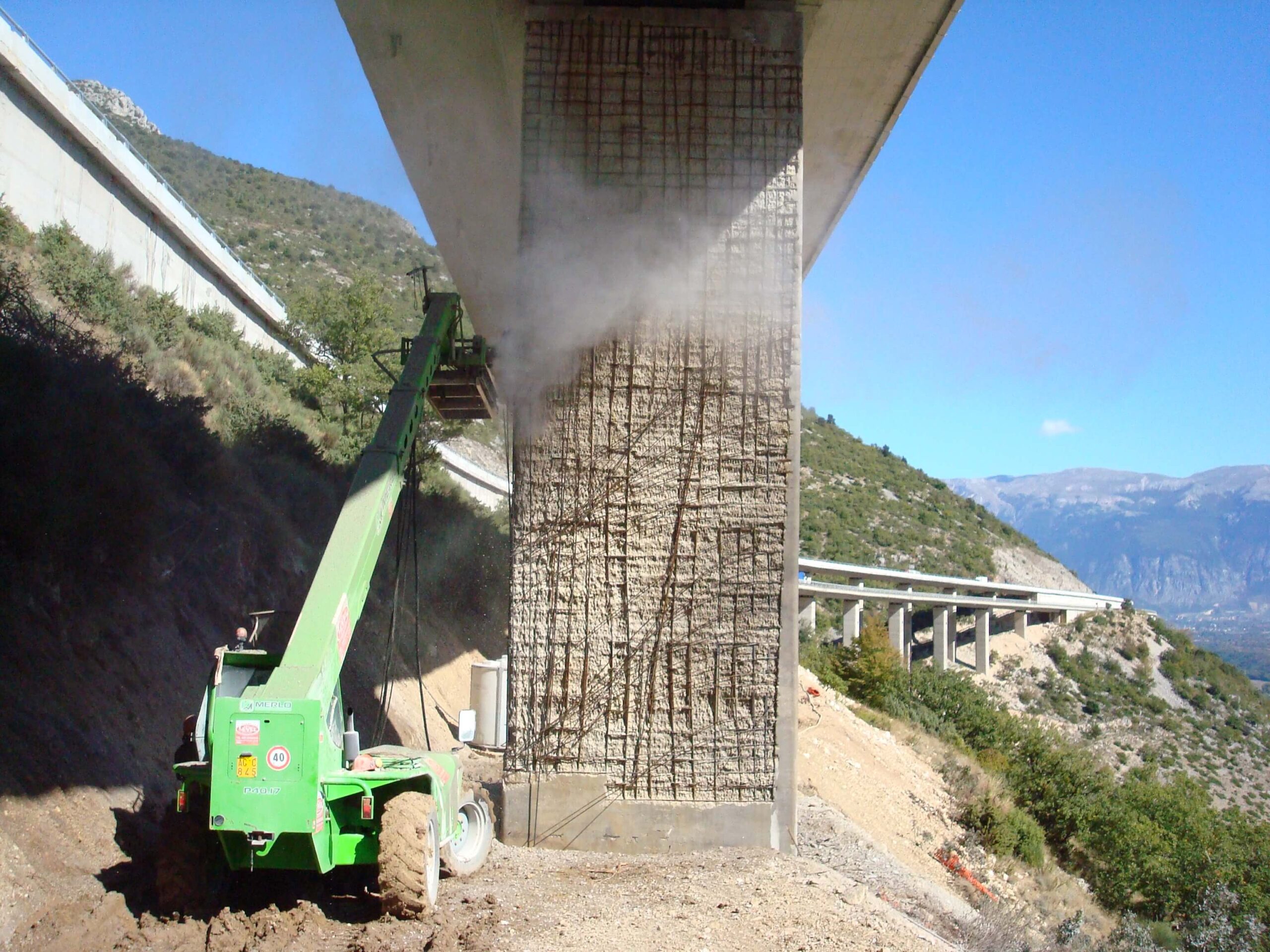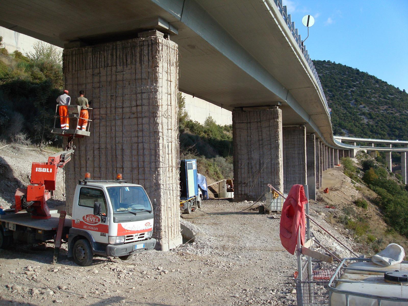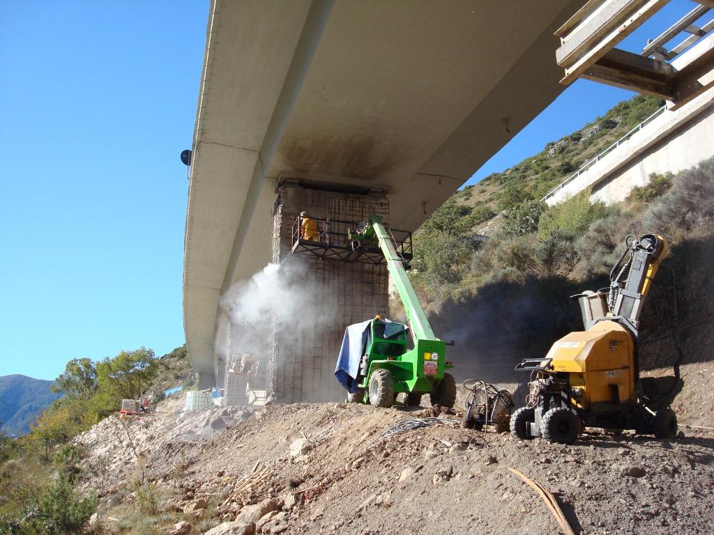 L’intervento ha riguardato l’idrodemolizione selettiva dei piloni del Viadotto S. Agapito, strutture in stato di forte degrado, con fioritura dei ferri d’armatura e calcestruzzo carbonatato in deterioramento. L’operazione è stata eseguita su pile alte da 6 fino a 15 metri, per un totale di circa 17.000 mq trattati.