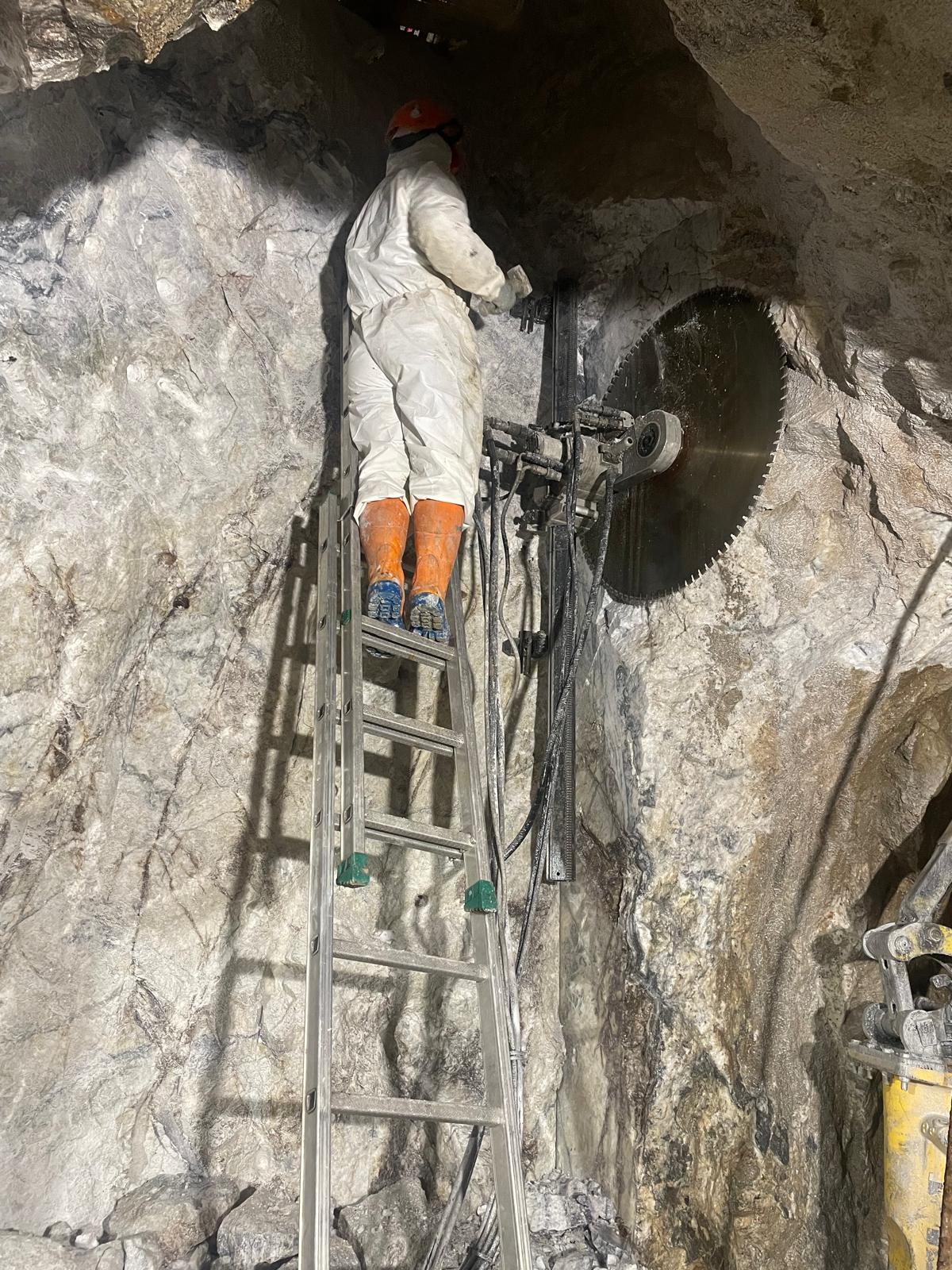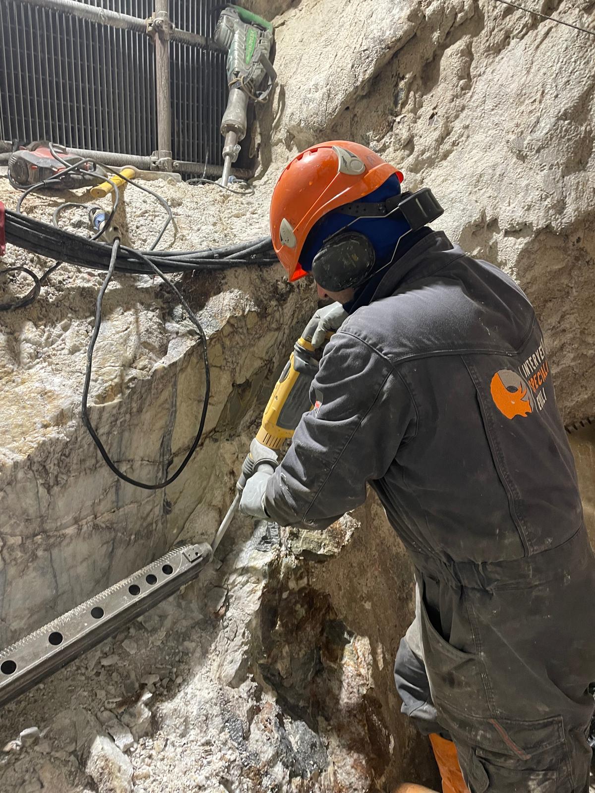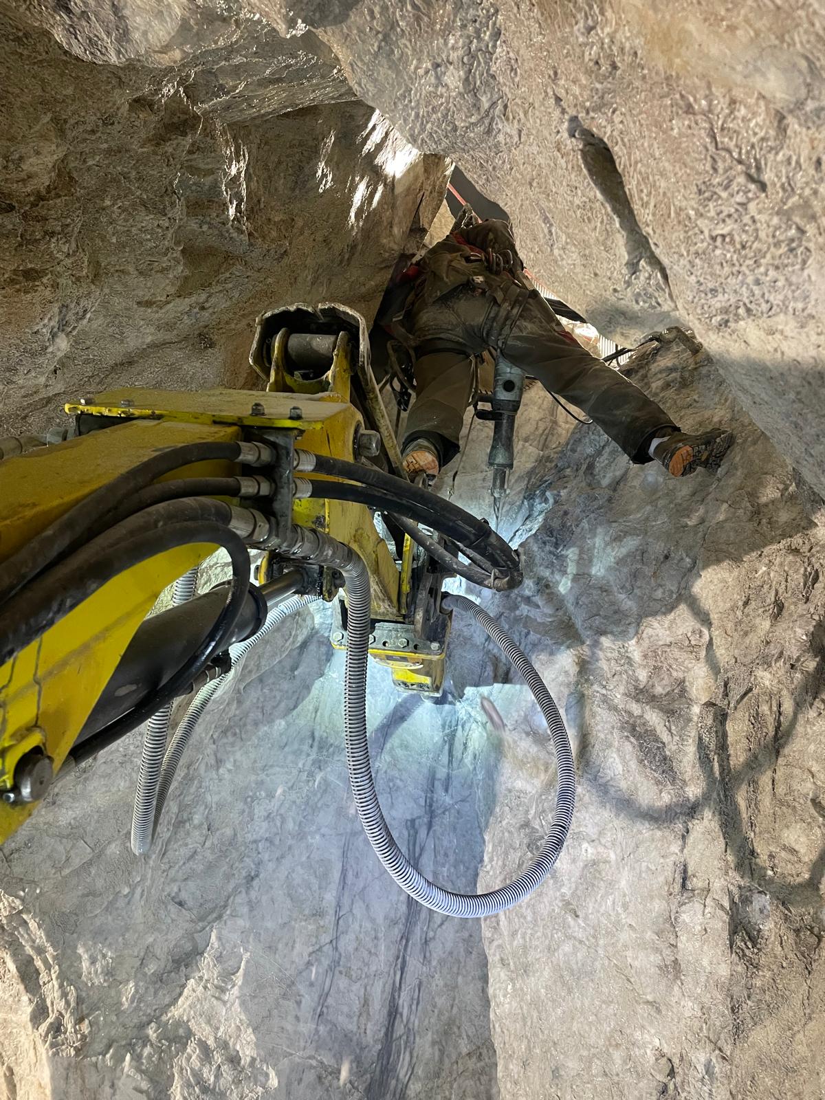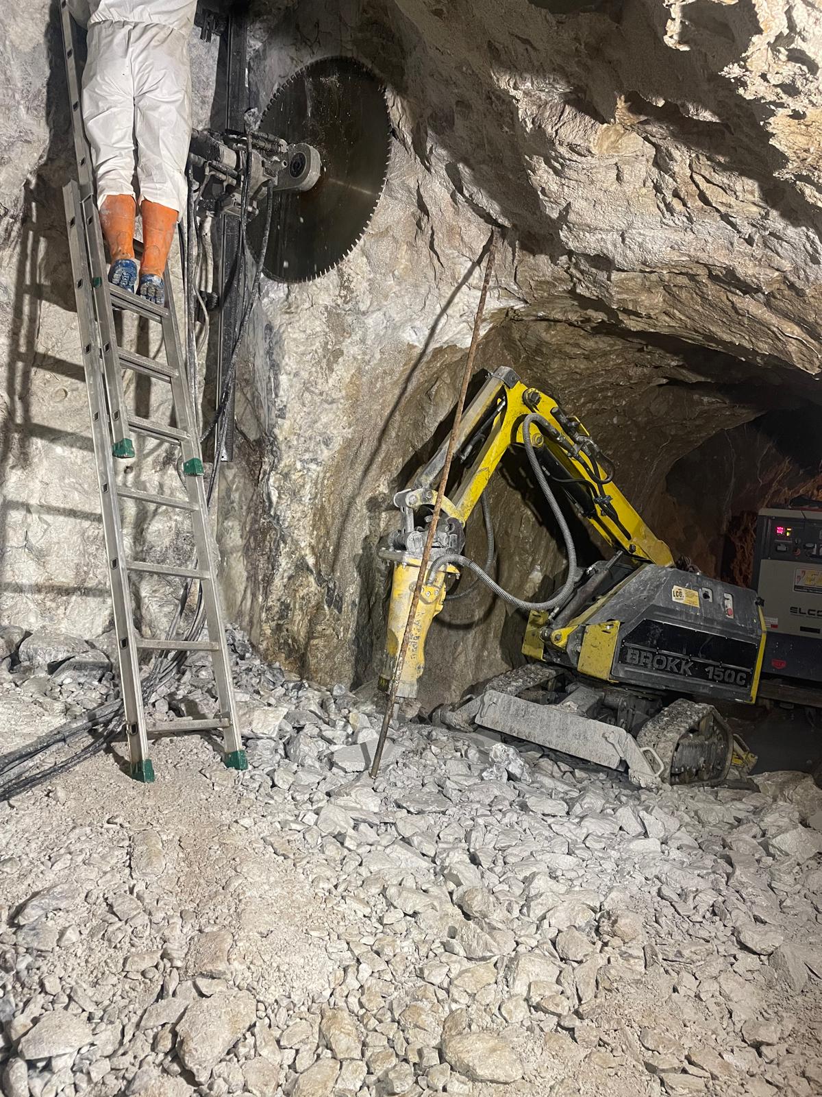 Una volta delimitate le porzioni da rimuovere, si è proceduto alla demolizione controllata: le masse rocciose sezionate sono state disgregate con l’ausilio del robot radiocomandato elettrico, che ha garantito precisione e sicurezza anche in condizioni di spazio limitato. Il materiale frantumato è stato quindi caricato su carrelli e rimosso dall’area di lavoro mediante carri da cava, per un volume complessivo di circa 40 m³ di roccia demolita.