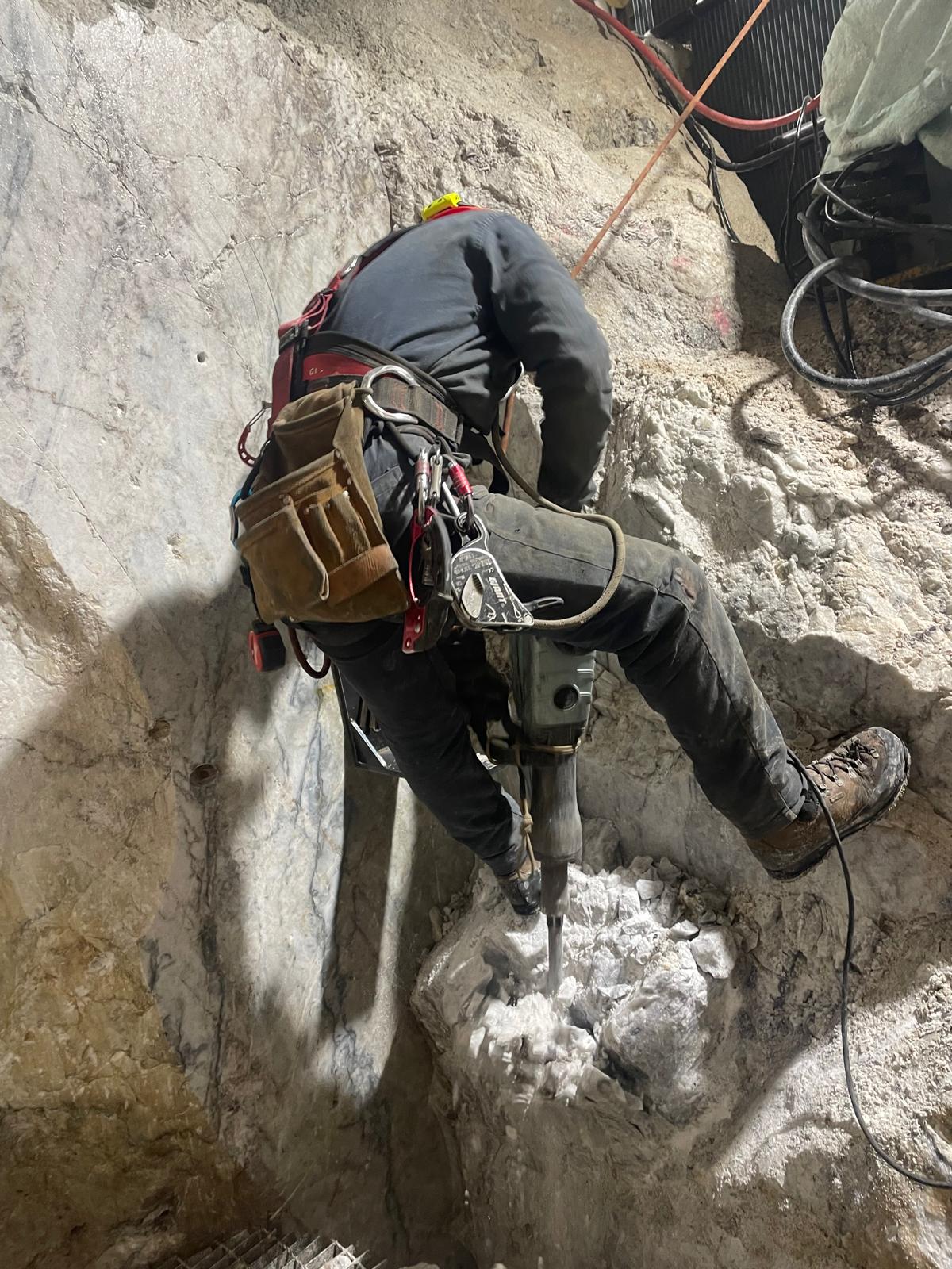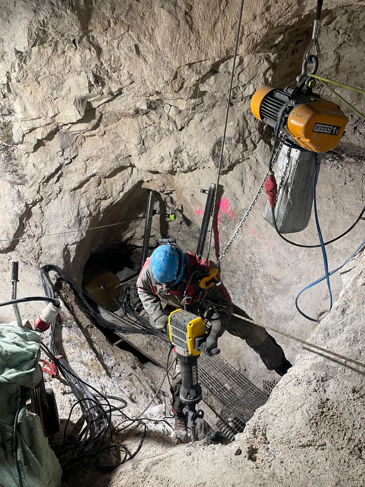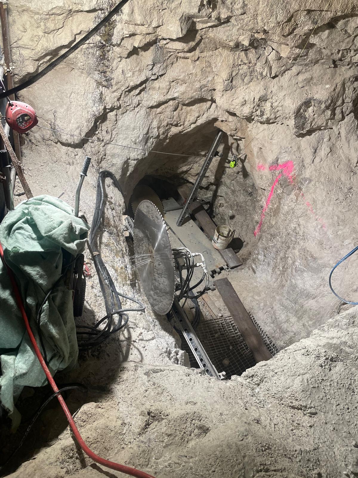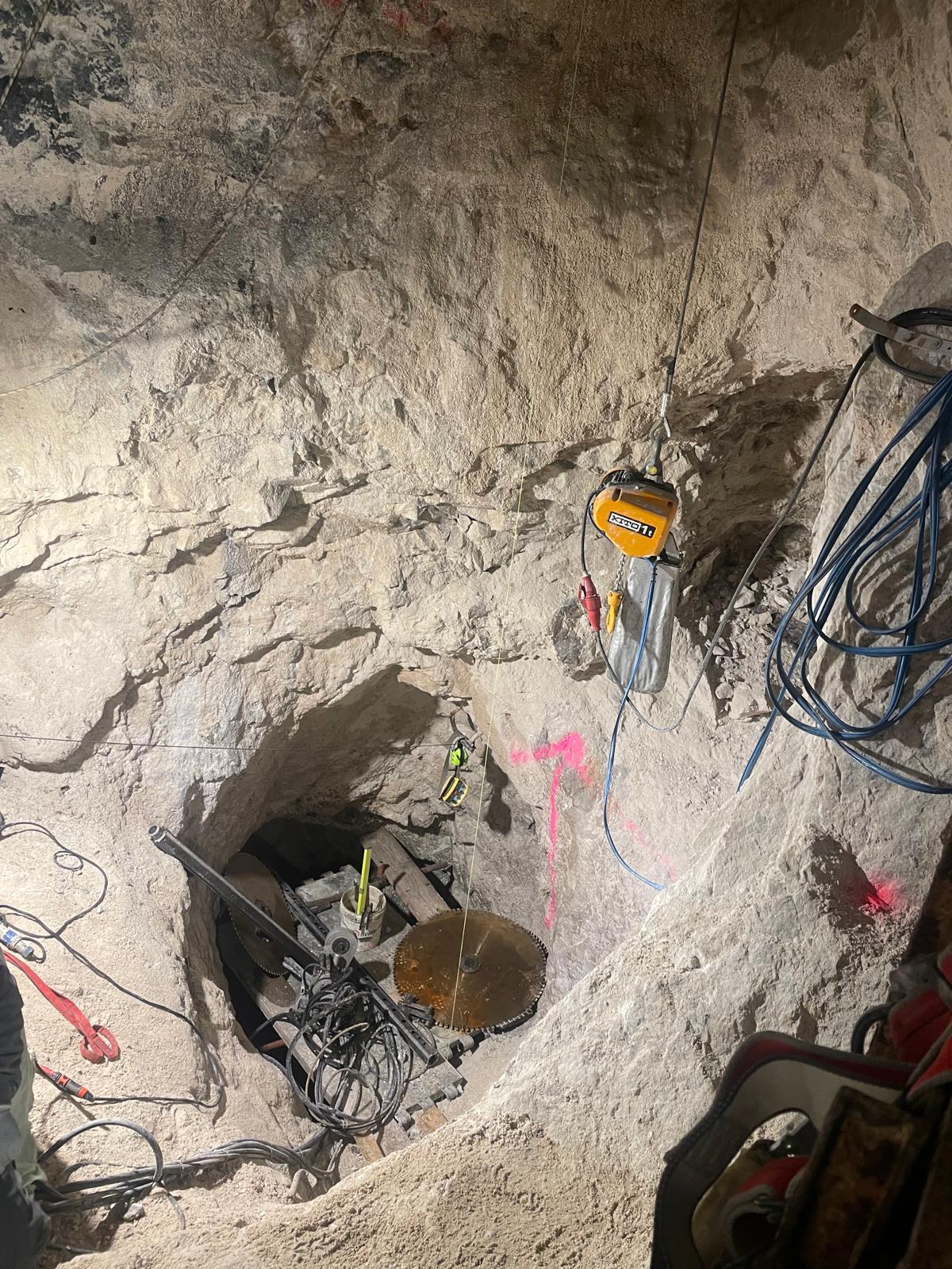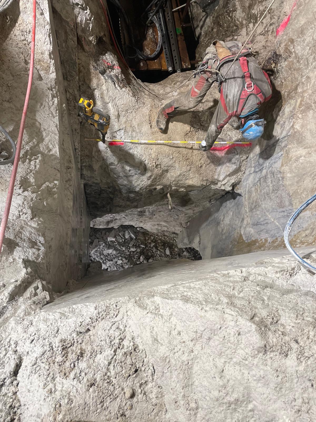 Una volta delimitate le porzioni da rimuovere, si è proceduto alla demolizione controllata: le masse rocciose sezionate sono state disgregate con l’ausilio del robot radiocomandato elettrico, che ha garantito precisione e sicurezza anche in condizioni di spazio limitato. Il materiale frantumato è stato quindi caricato su carrelli e rimosso dall’area di lavoro mediante carri da cava, per un volume complessivo di circa 40 m³ di roccia demolita.
