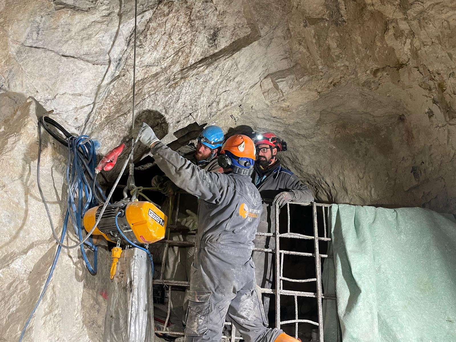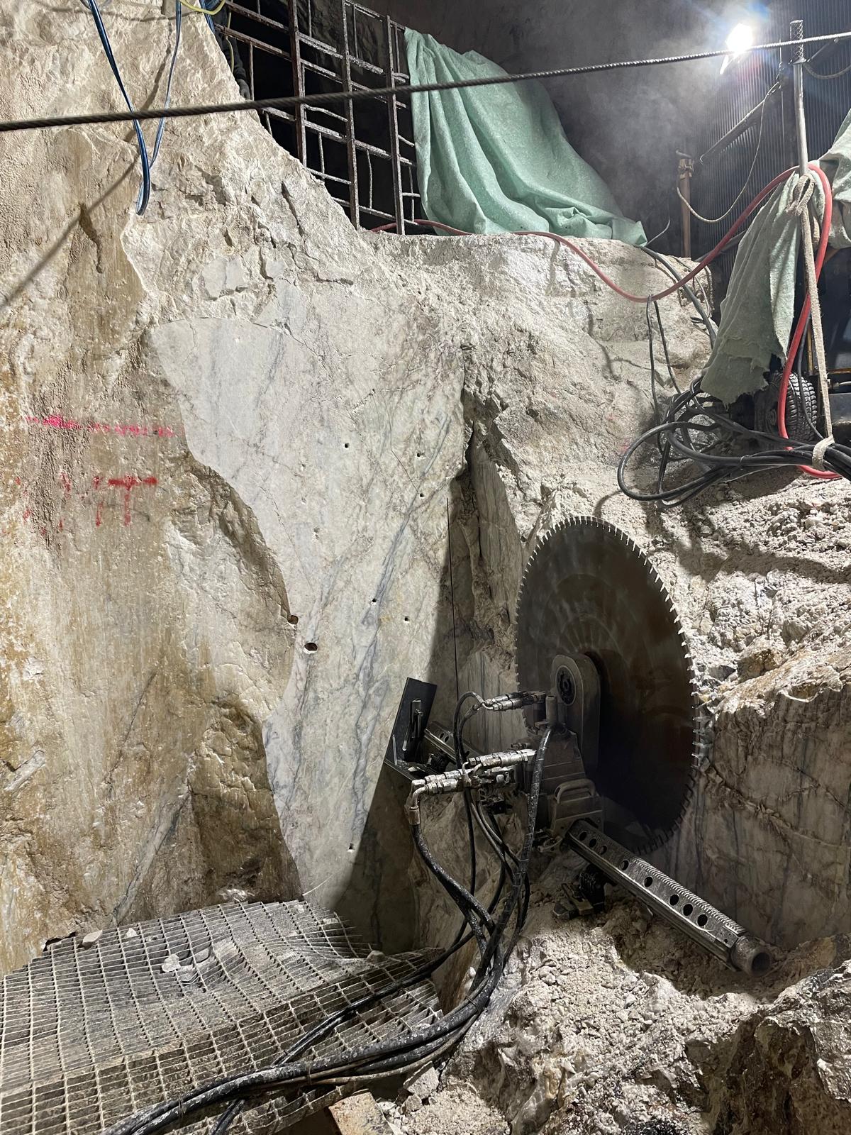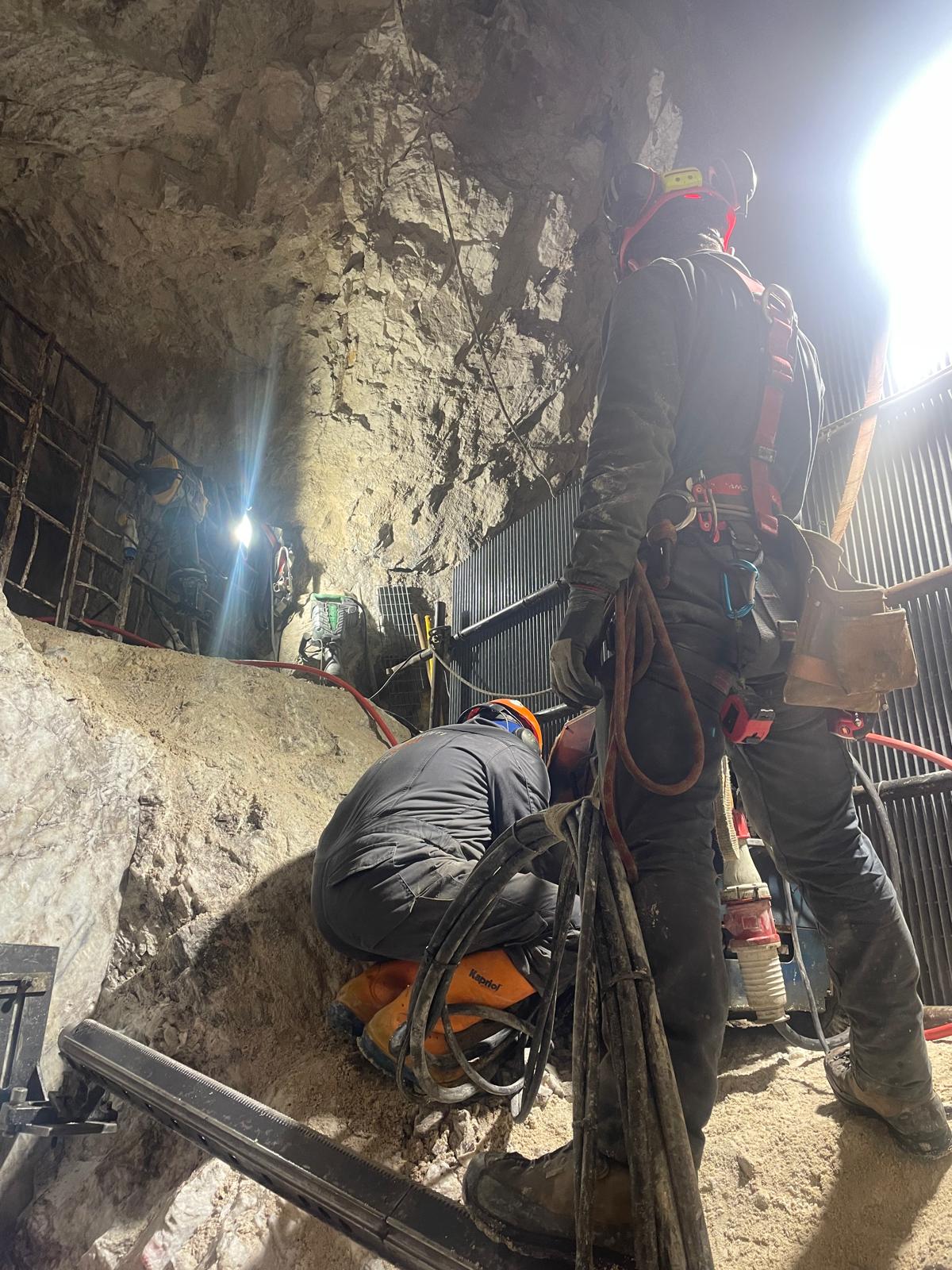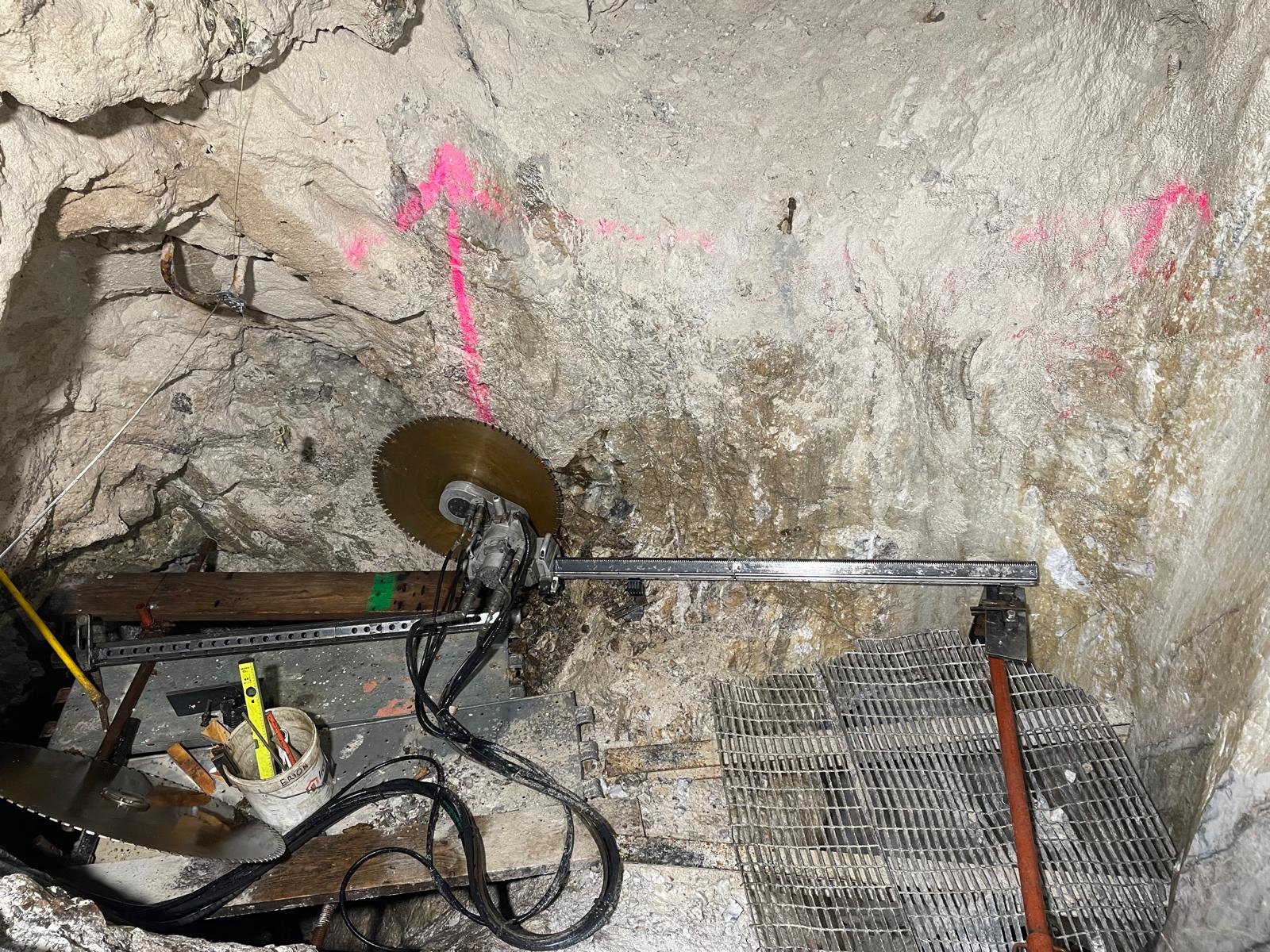 Una volta delimitate le porzioni da rimuovere, si è proceduto alla demolizione controllata: le masse rocciose sezionate sono state disgregate con l’ausilio del robot radiocomandato elettrico, che ha garantito precisione e sicurezza anche in condizioni di spazio limitato. Il materiale frantumato è stato quindi caricato su carrelli e rimosso dall’area di lavoro mediante carri da cava, per un volume complessivo di circa 40 m³ di roccia demolita.